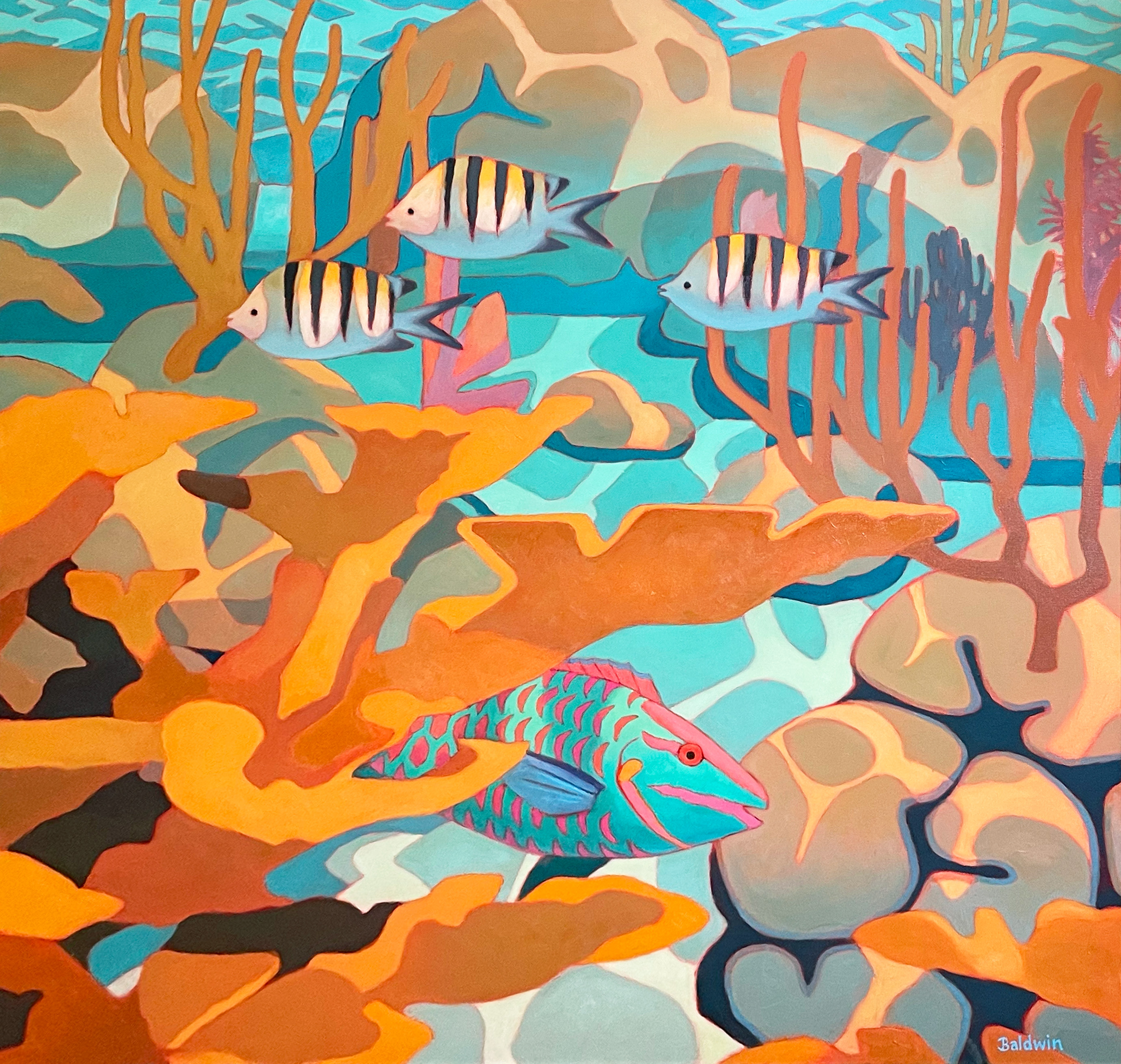 Queen Triggerfish with Sea Fans (24" x 24") This painting aims to depart from conventional depictions of coral environments, emphasizing light, color, and form, accentuating broken light—the way that environments and their components are often revealed in nature. This series draws on the artist's own observations. |